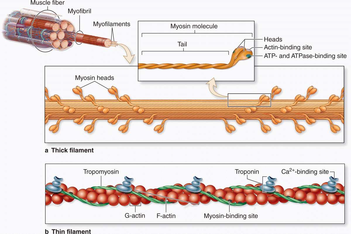 Within each sarcomere, arrays of thin (actin) and thick (myosin II) filaments slide past one another. Force generation occurs via cyclic interactions (“cross-bridges”) between myosin heads and actin: